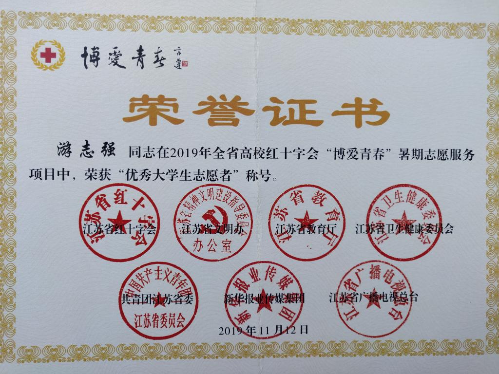 游志强同学荣获“优秀大学生志愿者”称号