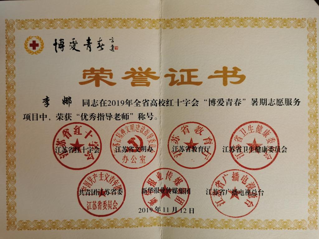 近日,由江苏省红十字会、省文明办、省教育厅、团省委、省志愿者协会联合开展的2019年江苏省“博爱青春”暑期社会实践支教项目评选结果公布。我校“大手拉小手,健康伴我行”暑期社会实践支教项目被评为省级立项项目,李娜老师荣获“优秀指导教师”称号,会计学院1801班游志强同学荣获“优秀大学生志愿者”称号。