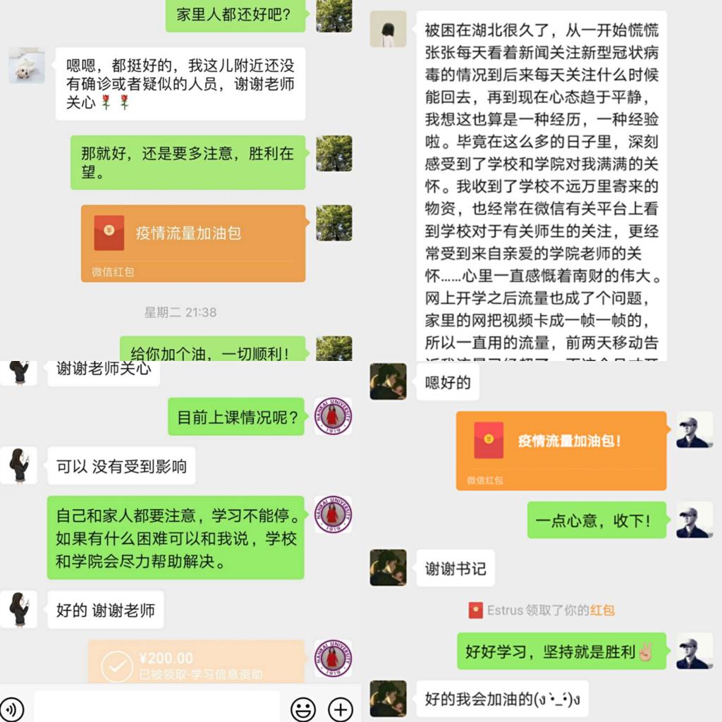 新冠肺炎疫情防控期间,南京财经大学采用线上教学保证“停课不停学,学习不延期”。在学校 “为学生送流量上网课”的基础之上,国贸学院进行了“流量使用”反馈调查,并进行了 “一对一”的资助,以微信红包的形式为学生们送去“抗疫流量加油包”,帮助同学们解决上网课流量不够的问题。