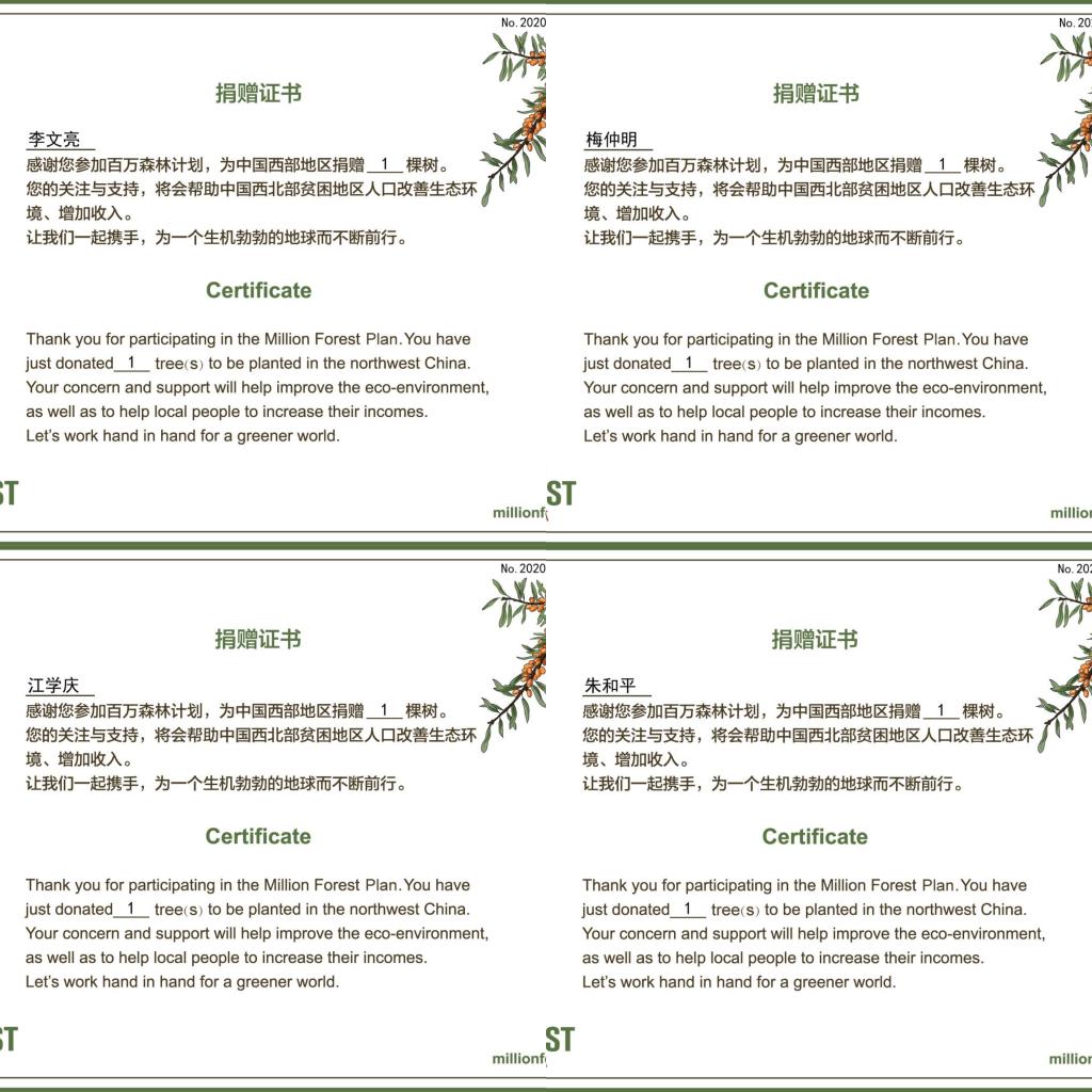 同学们以李文亮医生所在的武汉中心医院殉职医务人员名义捐赠树木的捐赠证书