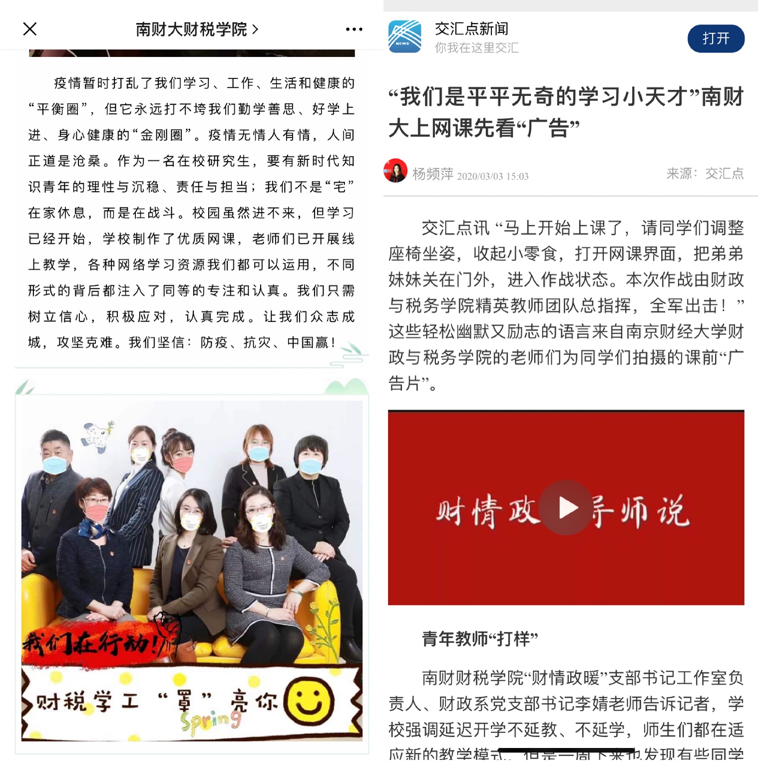 疫情期间,为了更好地贯彻“停课不停学”,财政与税务学院党委“财情政暖支部书记工作室”“税月初心支部书记工作室”以及学工队伍联合推出“导师说”系列,党员教师们录制宣传片、撰写寄语文案,在线上开展领学导学,带领同学们在特殊的日子里精心读书、充实自己,引发了同学们的强烈共鸣。