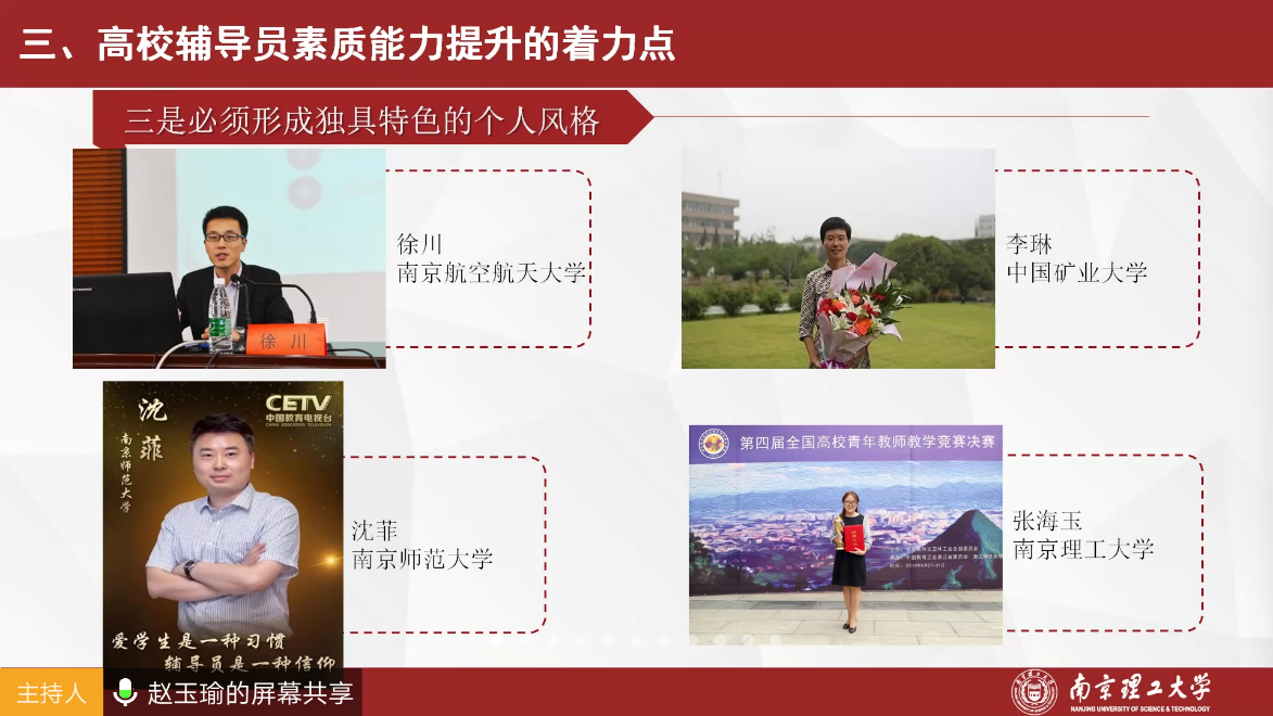 赵玉瑜老师畅谈了她对辅导员这个岗位的认识,她认为这次疫情防控阻击战,更加凸显了辅导员是伟大工程的施工员、伟大事业的质检员、伟大斗争的战斗员、伟大梦想的服务员,所有辅导员应保持忠于岗位的工作热情、养成时刻积累的学习习惯、形成独具特色的个人风格。她建议大家要摆正工作态度,开心生活和工作,结合时代,开拓创新,使思政方法更加多元化和立体化。