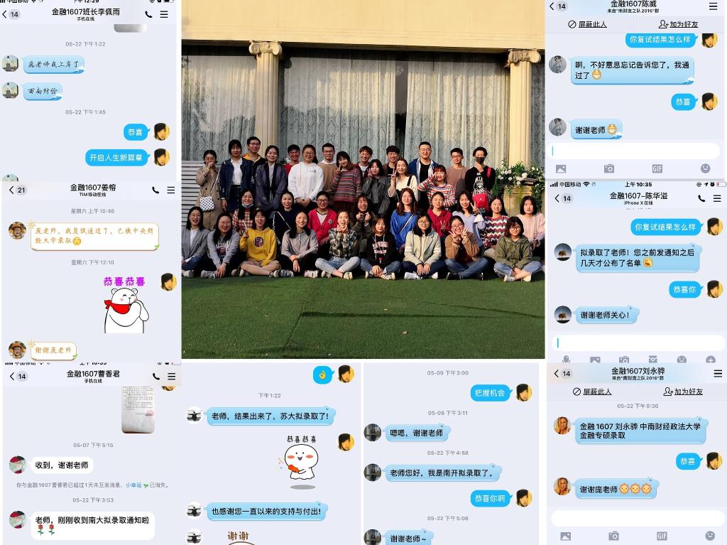 随着2020年全国硕士研究生考试录取结果陆续公布,金融学院金融1607班捷报频传,班级考研录取率37%,上线率达81%,多位同学被南京大学、南开大学、中央财经大学、上海财经大学、西南财经大学等知名高校录取。
