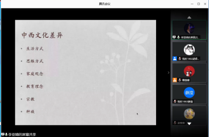 财税学院老师李亚婧通过腾讯会议分享了她访学美国杜克大学期间感受到的中西方文化差异。李亚婧老师向同学们介绍了她在美国杜克大学学习和生活期间的感受,并从生活方式、思维方式、家庭观念、教育理念、宗教种族等多个方面讲述了她所感受到的中西方文化差异。