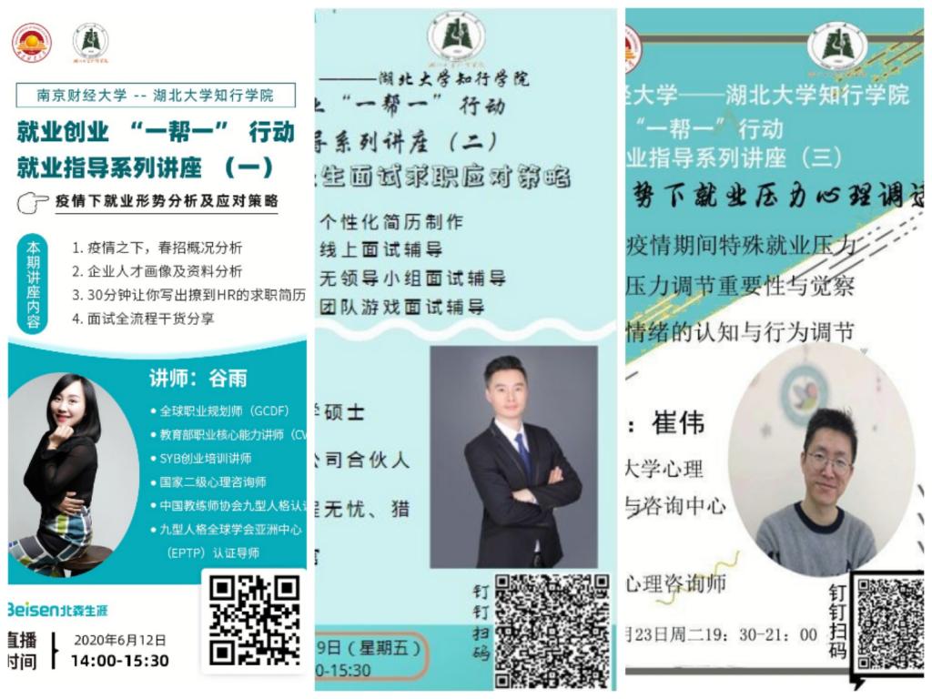 6月12日至23日,面向南京财经大学和湖北大学知行学院2020届毕业生的系列就业指导讲座线上开讲,专业人才测评公司合伙人郭伟、北森生涯职业讲师谷雨、我校心理咨询师崔伟分享了疫情形势下就业形势、求职简历与面试、心理压力与调试等内容,带领两校毕业生一起解读当下的就业形势,学习必要的面试技巧,提高毕业生疫情期间的就业意识和竞争力。1000多名学生聆听了讲座,并进行了线上咨询互动。