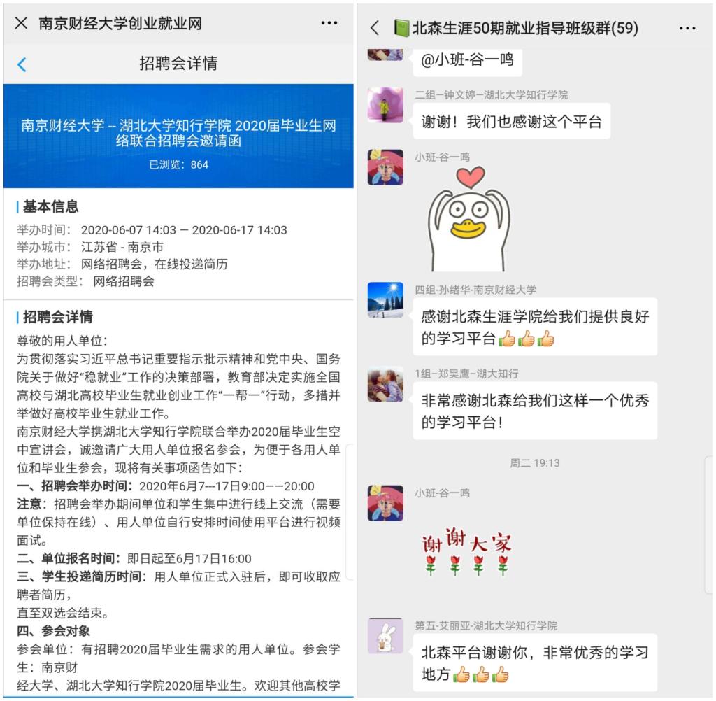 6月7日至17日,南京财经大学-湖北大学知行学院2020届毕业生网络联合招聘会通过智联招聘平台成功举办。其中参会单位353家,全部职位数1334个,招聘人数15836人,学生报名数1770人,投递量1378次。