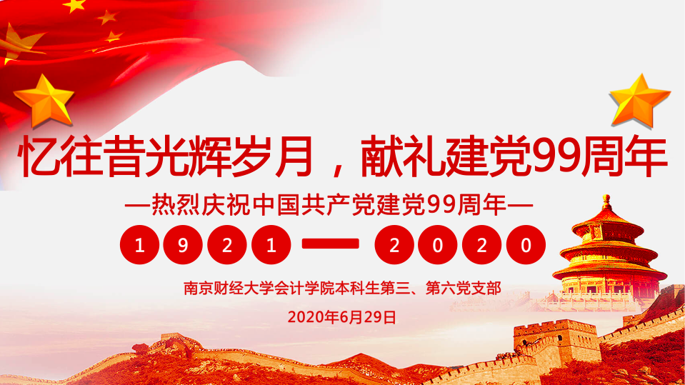 会计学院本科生第三党支部、第六党支部共同开展了“忆往昔光辉岁月,献礼建党99周年”线上主题党日活动,礼赞党的生日。全体党员观看了中国共产党99年的发展历史视频。邀请了三位党员同学重述家乡的红色故事,让红色血脉在青年中相传。党员龙歆娴介绍了在福建龙岩召开的党的重要会议——古田会议。党员李欣婷讲述了在江苏徐州爆发的党的经典战役——淮海战役。党员邓诗与展现了重庆不朽的革命精神——红岩精神。最后,由党支部书记徐永宁领誓,全体党员重温入党誓词,在党旗前立下庄重承诺,始终不忘党员身份,始终扛起共产党员的这面旗帜,砥砺前行,为实现中华民族伟大复兴的中国梦奉献青春力量。