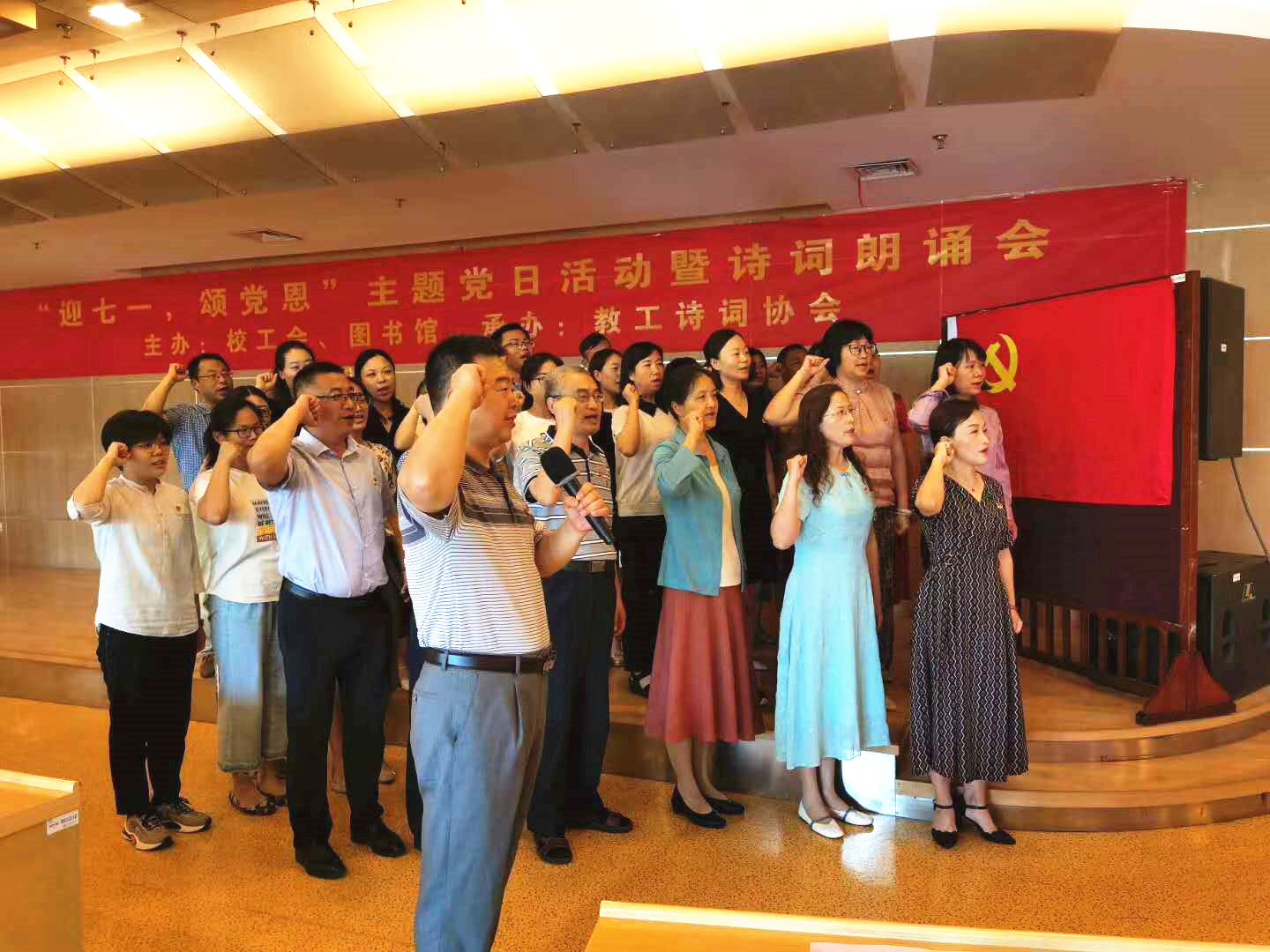 7月1日下午,由校工会、图书馆联合主办,校教职工诗词协会承办的“迎七一•颂党恩”庆祝建党99周年主题党日活动暨诗词朗诵会在仙林校区图书馆一楼音乐欣赏厅举行。校工会、图书馆四个支部全体党员,党外人士代表、诗词协会代表共40余人在图书馆音乐厅共聚一堂,重温入党誓词、诵读红色经典诗词,讴歌实现中华民族伟大复兴中国梦的奋斗历程,过了一个特别有意义的“政治生日”。全体党员重温了入党誓词,面对鲜红的党旗,再次庄严宣誓:“我志愿加入中国共产党……随时准备为党和人民牺牲一切,永不叛党。”铿锵的誓词让全体党员灵魂上再次受到洗礼,进一步增强了党员的光荣感和使命感,坚定了广大党员教职工的信仰,体现了党员同志们对中国共产党的无限忠诚。党员同志们以热情饱满的诗词诵读、红歌咏唱的形式讴歌了党的丰功伟绩,校教工诗词协会的会员们热情洋溢地朗诵了他们原创的诗作。最后,活动在现场全体党员群情激昂的《没有共产党,就没有新中国》的旋律中圆满落幕。
