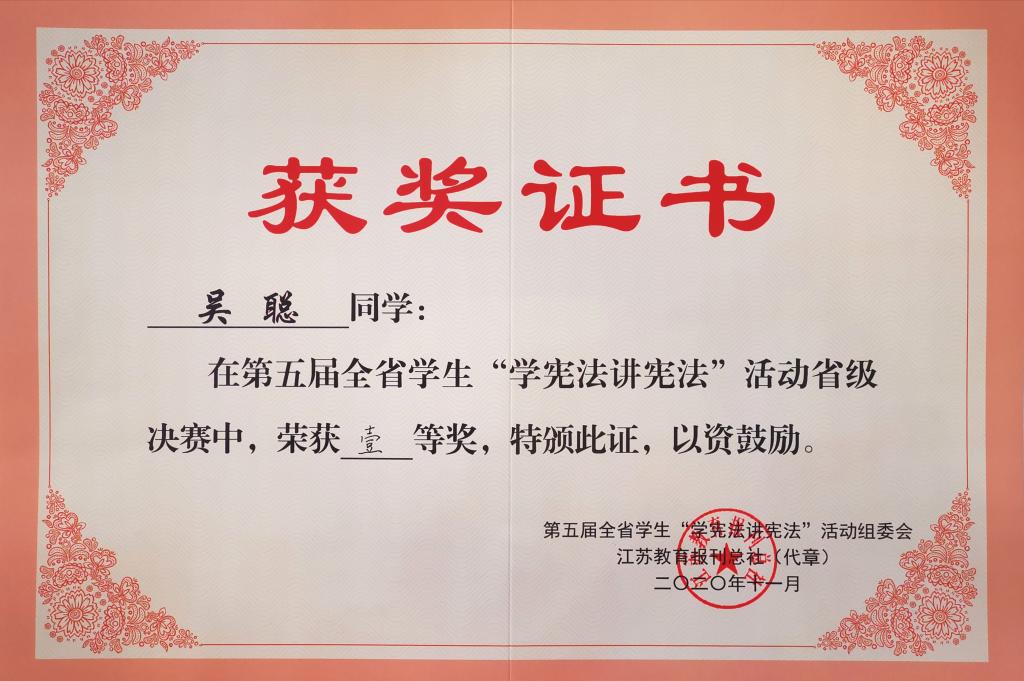 11月7日-8日,第五届全省学生“学宪法讲宪法”活动省级决赛在江苏警官学院景程大厦报告厅举办。我校法学院学生吴聪、孙一盈分别获法治知识竞赛一等奖和演讲比赛一等奖。