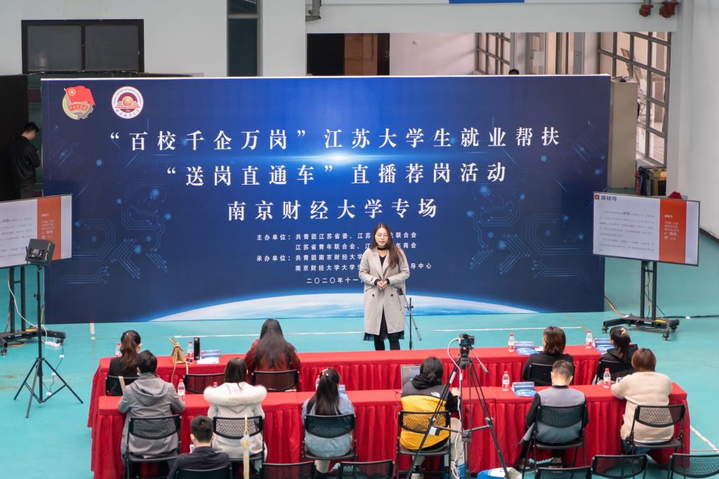 招聘会现场,校团委承办了“百校千企万岗”江苏大学生就业帮扶“送岗直通车”直播荐岗活动南京财经大学专场,现场10余家用人单位通过线上直播、线下面试相结合的方式,为全省高校毕业生提供线上就业岗位推荐、就业观引导等就业服务,助力毕业生实现更高质量就业。值得一提的是,此次直播活动在线观看人数超1200人次,反响热烈。
