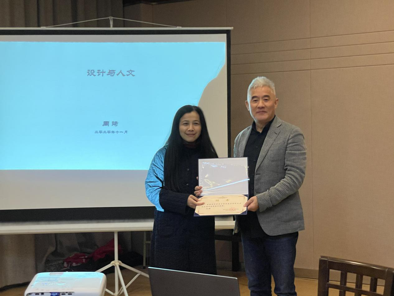 讲座开始前,丁蕾院长对周琦教授莅临艺术设计学院表示热烈欢迎,并为周琦教授颁发了艺术设计学院兼职教授聘书。