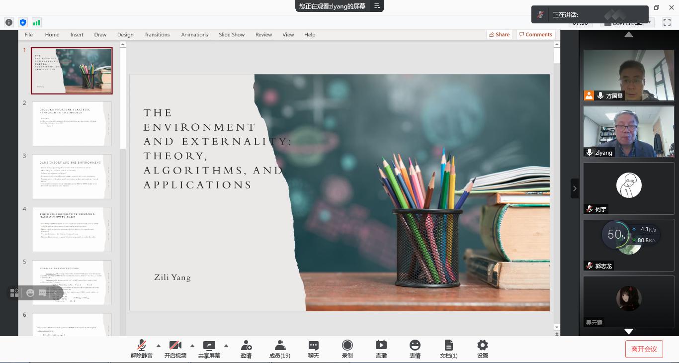 5月8日上午,美国纽约州立大学宾汉姆顿分校经济系杨自力教授在腾讯会议平台为我校学子作了题为“The Environment and Extemality-Theory, Algorithms,and Applications”的学术讲座。本次讲座旨在培养本科生的科研兴趣,提升研究生的学术素养,活跃学院学术氛围。学院部分教师、研究生、本科生以及北京理工大学、南京师范大学、江苏大学等高校的部分教师和研究生参与了此次讲座。讲座由经济学院教授方国昌主持。