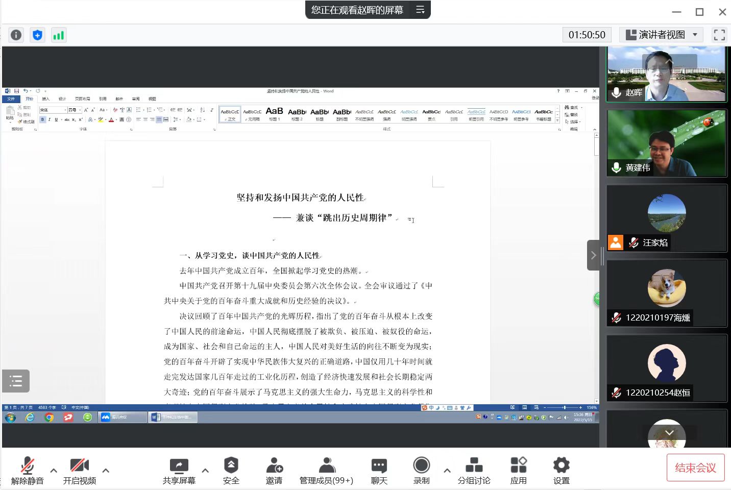 5月15日下午,应公共管理学院邀请,江苏省政治学会副会长、南京师范大学公共管理学院MPA中心主任赵晖教授在线作了题为“坚持和发扬中国共产党的人民性——兼谈‘跳出历史周期律’”的讲座。公共管理学院部分MPA师生、学术型研究生和高年级本科生共100余人聆听了讲座。讲座由公共管理学院院长、MPA教育中心主任黄建伟教授主持。