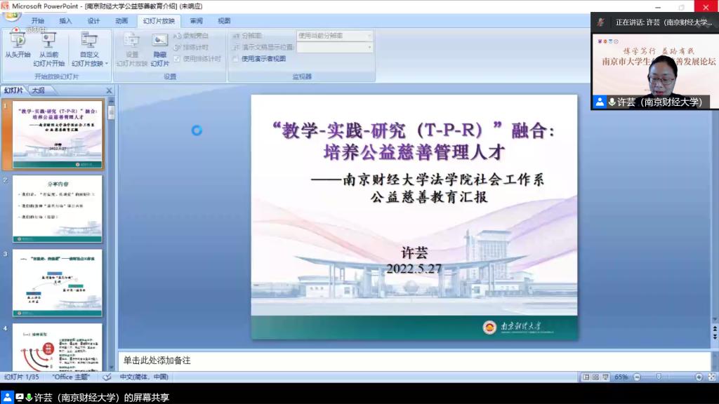5月27日,由我校法学院、南京大学社会学院、南京工业大学浦江学院公益慈善管理学院共同主办的南京市大学生公益慈善发展论坛于线上举行。本次论坛以“博学笃行,益路有我”主题。浙江敦和慈善基金会提供资助,美亚联创(北京)科技有限公司提供技术支持。来自南京大学、南京财经大学、河海大学、南京师范大学等十余所高校的大学生们汇报和交流了31项公益实践项目和研究论文,热烈探讨公益慈善领域的行动与研究。据统计,全天共有近1000位师生通过线上直播频道观看论坛。