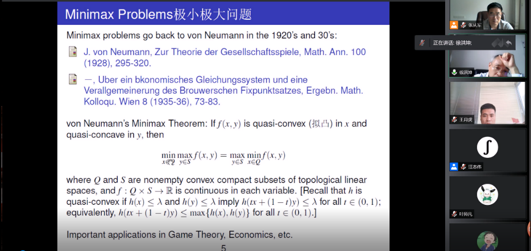 徐洪坤教授介绍了非线性分析中极小极大问题的研究背景、现状、动态和主要研究成果,非扩展映射的不动点理论和相关算法,变分不等式问题以及它们之间的相互应用。徐洪坤教授和相关学者的一些最新研究成果,特别是极小极大问题在机器学习中的应用,引起了与会师生的广泛兴趣。报告会后,徐洪坤教授和参会师生展开了交流和互动。