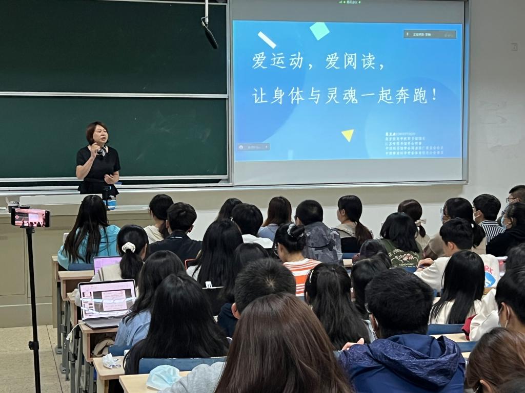 讲座中,葛见珠馆长以“爱运动,爱阅读,让身体与灵魂一起奔跑”为主题,回顾了自己自2017年立下打卡图书馆目标以来走过的图书馆、读过的书、遇见的人以及所获所感。葛见珠馆长用“一生二、二生三、三生万物”总结书店打卡的收获,用“书——书店——讲座——书友——作家——文化名人——读书组织——人生好友”这一连锁反应来概括阅读带来的收获。葛见珠馆长认为有书就有力量,她从阅读对家人的影响、对学生的影响、对未知的影响、对工作的影响等方面深度阐释了阅读这一“精神操练”为人生带来的益处。讲座最后,葛见珠馆长亲身示范,引导大家用健康向上、积极优美的姿态迎接大学生活。