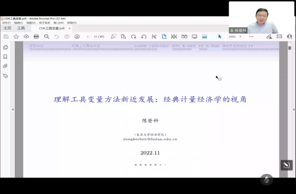 11月10日晚,财政与税务学院“财税青年讲坛”邀请复旦大学经济学院研究员陈登科于线上作了题为“理解工具变量方法新近发展:经典计量经济学的视角”的学术报告。本次讲坛由学院院长余泳泽教授主持。学院部分师生参加讲座。