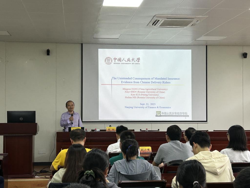 9月22日下午,应经济学院邀请,中国人民大学聂辉华教授在仙林校区德经楼307会议室作了题为“The Unintended Consequences of Mandated Insurance: Evidence from Chinese Delivery Riders(政府强制保险的未意料后果:来自中国外卖骑手的证据)”的学术讲座。讲座由我校副校长张炳教授主持。经济学院院长朱红根、国际经贸学院院长余泳泽、信息工程学院院长黄健、学校部分教师和研究生参加讲座。
