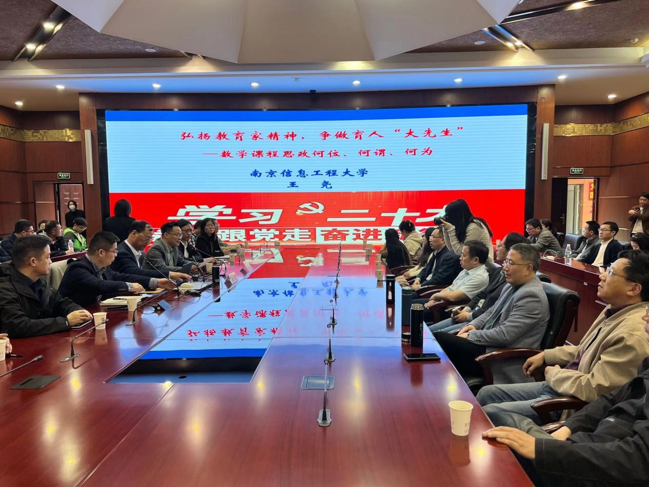 4月11日下午,应应用数学学院邀请,南京信息工程大学原党委副书记、副校长(正校级)、博士生导师王尧教授在仙林校区工科楼二楼报告厅作主题为“大力弘扬教育家精神,争做新时代育人‘大先生’——数学课程思政何谓、何位、何为”的学术报告。应用数学学院党政领导、全体教师、部分研究生和本科生参加学习。报告由我校副校长张炳教授主持。