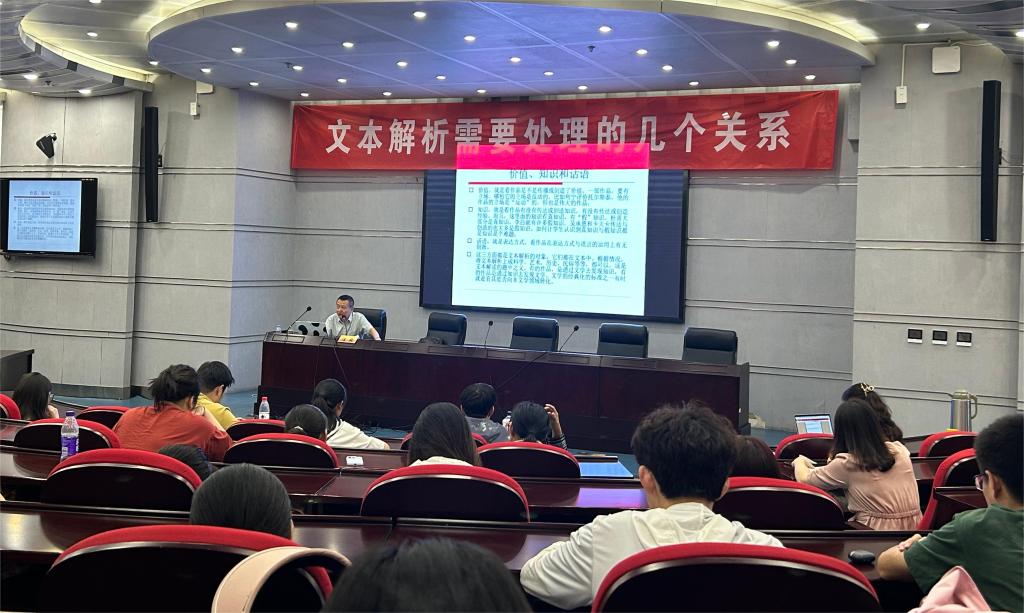 汪政教授从当前人工智能时代下的文学写作现状谈起,以文学批评家的视角指出“文本解析”作为基本功,在文学阅读与研究中所处的重要地位。他以文艺理论为中心,以具体作品为依托,分别围绕文学作品的“主体关系”“写什么”“怎么写”等内容范畴,重点讲述了“文本解析”需要处理的十大关系:批评家与读者、文本的内与外、文体的有无与常变、方法的多少与新旧、文本的过去与现在、作者的有与无、虚与实、书写与声音、文字文本与非文字文本、文本与生活等,其中在“文本的内与外”关系中,他提出衡量文学作品的三个标准即价值、知识和话语,并以第十一届茅盾文学奖获奖作品为例,阐释了价值立场、知识架构和话语体系的构成与要义。汪政主席倡导当代人作为读者,要学会生活、热爱生活,只有当文本阅读与生活体验交融时,才能真正体悟文本的丰富内涵。