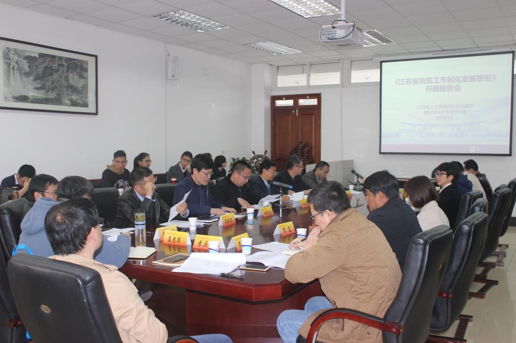 4月2日下午,受江苏省人力资源和社会保障厅委托,由我校经济学院承担的《江苏省农民工市民化发展报告》课题的开题报告会在仙林校区德经楼408举办。本次会议由江苏省人力资源和社会保障厅和经济学院主办,经济学院副院长(主持工作)朱红根主持,科研处副处长杜修立代表科研处对会议的召开表示祝贺。江苏省人力资源和社会保障厅农民工工作处处长陈汝军、南京市农民工工作处处长周正南,教务处处长叶林祥、经济学院副院长尹敬东、课题负责人章莉教授、南京市街道基层从事人社服务的领导以及经济学院部分教师和研究生参加了此次会议。