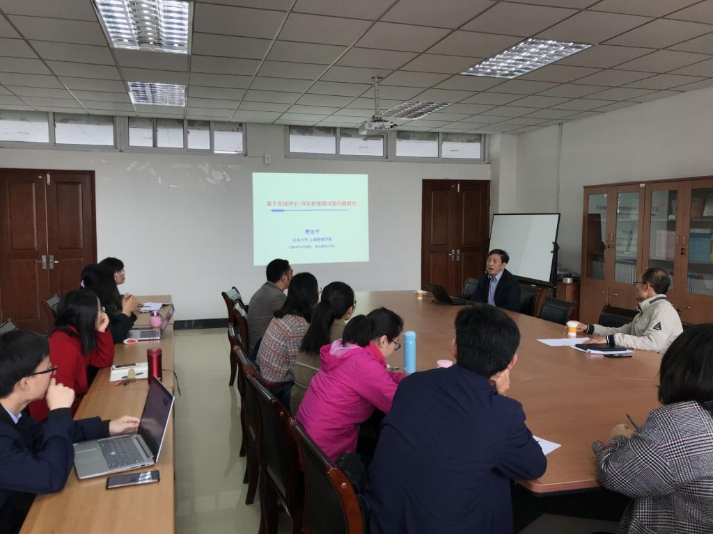 4月28日,应管理科学与工程学院邀请,东北大学工商管理学院副院长樊治平教授,在我校德济楼507会议室作了题为“基于在线评价/评论的管理决策问题研究”的学术讲座,讲座由管理科学与工程学院副院长黄健教授主持,管理科学与工程学院部分师生聆听了此次讲座。