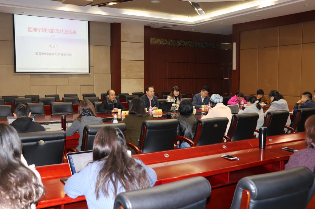 讲座围绕“管理学研究的现状及发展趋势”展开,刘云川教授分享了独创的管理学研究三阶段论述,特别讲述了华人学者在管理学前沿研究的贡献与不足、管理学理论与实践的关系、管理学研究与教学的联系,并用自己在《Marketing Science》《Management Science》等UTD顶尖期刊发表的文章为例阐述发展动向以及管理学院内部的跨学科研究。讲座结束后,现场青年教师与刘云川教授进行学术交流,现场反响热烈。