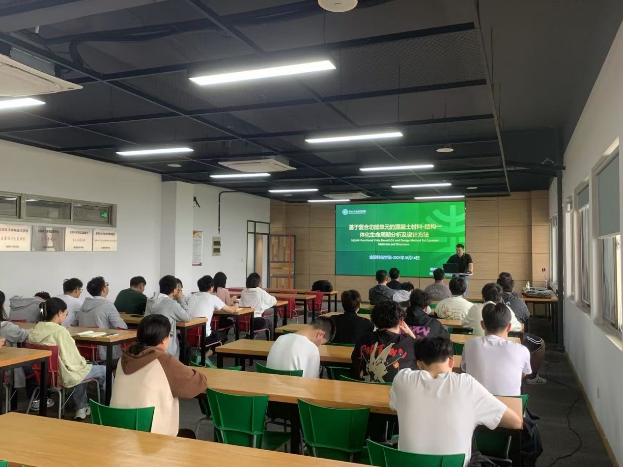 谢天宇围绕复合功能单元的生命周期分析框架、长寿命结构化光伏系统、混凝土结构电池原位储能技术与零能耗建筑装饰材料应用等多个主题,结合我国土木工程领域绿色、低碳等多个学科前沿方向,介绍了课题组近期研究和应用成果。期间,我院师生与谢教授就混凝土材料性能、添加物的影响性、碳成本等学术问题进行了深入交流和充分探讨。