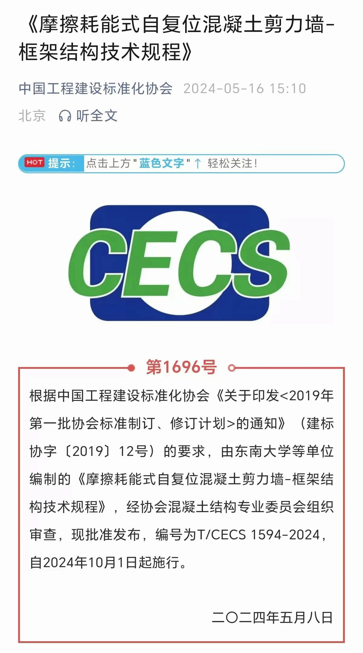 近日,中国工程建设标准化协会发布通知,由东南大学主编、云顶集团等单位参编的《摩擦耗能式自复位混凝土剪力墙-框架结构技术规程》(T/CECS1594-2024)批准发布,自2024年10月1日起施行。
