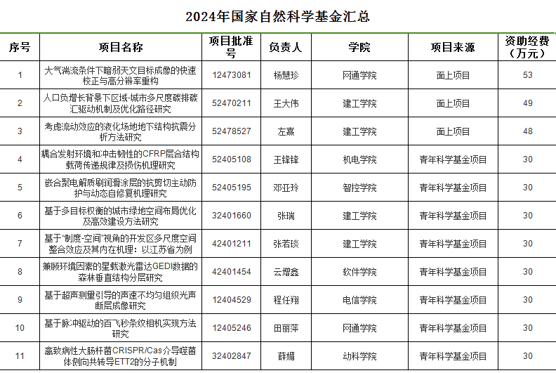 近日,国家自然科学基金委员会公布了2024年度国家自然科学基金项目的评审结果,我院获资助项目4项,其中,左熹教授和王大伟副教授获批面上项目2项、张若琰和张瑞两位年轻老师获批青年科学基金项目2项,立项数、经费数均较去年明显提升。面上项目立项取得历史性突破。