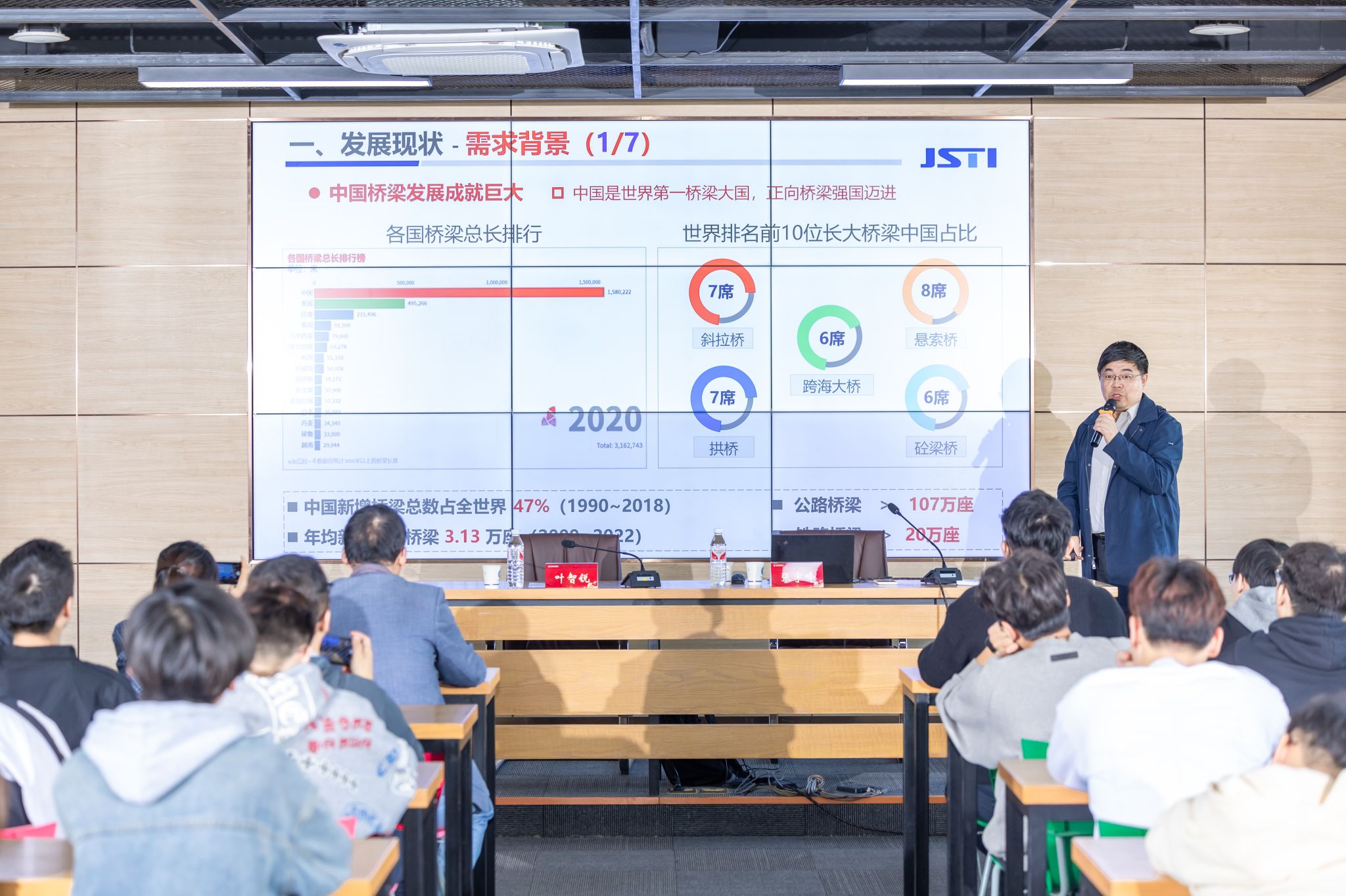 张宇峰从中国桥梁发展现状出发,巧妙地以人体疾病诊断为比喻,生动诠释了桥梁结构健康监测的重要意义,迅速吸引了参会学生的注意力。他指出,我国桥梁建设成就巨大,但桥梁安全形势依然严峻,特别是在役桥梁老龄化加速到来的背景下,采用桥梁健康监测技术,为桥梁安全运营提供科学依据显得尤为重要。在技术趋势方面,张宇峰分析了当前面临的技术瓶颈,包括系统实施过程中的重难点、特大桥系统与常规桥梁系统的不同需求等,并分享了已有的技术突破和未来的发展趋势。他强调,随着人工智能、大数据等技术的发展,桥梁健康监测技术将迎来高峰期,进一步推动智慧桥梁管理的实现。