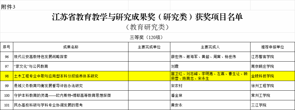 我院“土木工程专业中职与应用型本科分段培养体系研究”项目获2018年江苏省教育教学与研究成果奖(研究类)(教育研究类)三等奖;我院左熹、毛昆明老师参与的“一体化榫接复合保温墙关键技术创新及其应用”项目获2018年江苏省教育教学与研究成果奖(研究类)(高校自然科学研究类)三等奖。
