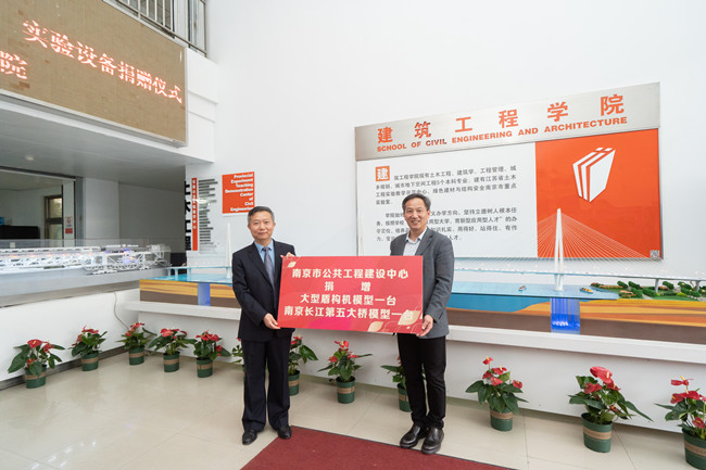 11月18日,我院86届道路桥梁专业杰出校友、南京市公共工程建设中心主任武焕陵代表市公建中心向我院捐赠了大型盾构机模型和南京长江第五大桥模型。校纪委书记丁鹏、建工学院师生代表参加了捐赠仪式。