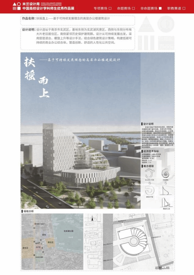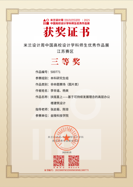 2025年7月,云顶集团建筑系教师组织学生50人,投递作品25项,取得了较好的成绩。由张启菊、陈琼老师指导,李非遥、杨爽创作的《扶摇直上——基于可持续发展理念的高层办公楼建筑设计》;由孟祥婉、葛少峰老师指导的,袁芝雯创作的《集庆有佳、缘来园趣——城市老旧社区集合化织补设计研究》;由薛云、龚亚西老师指导袁芝雯创作的《虚室有余闲》;由钮飞越创作的《梯上绿洲——商业综合体设计》四项作品作品荣获江苏赛区三等奖。